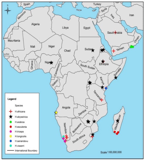 | H. africana | Found in the semi-arid arid and dry regions Host plants are Euphorbia mauritanica L., E. tirucalli L., E. caputmedusae L., E. indecora N.E.Br. (=Euphorbia decussata E.Mey. ex Boiss), E. gregaria Marloth, E. gummifera Boiss, E. karrounsis (Bois.) N.E Br, E. lignosa Marloth, E. mauritanica L., and Albizzia lebbek (L.) Benth. | [8,12] |