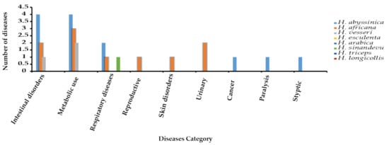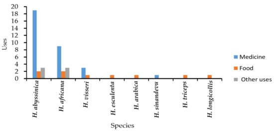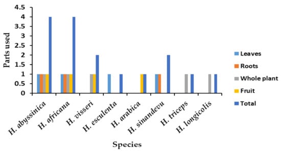 | H. abyssinica | Food, treat dysentery, diarrhea, cholera, swelling of tonsillitis, charcoal, tanning leather, paralysis, diabetes, hiccups, fever, insomnia, hypertension, measles, hemorrhoids, throat inflammation, styptic gastric ulcer, and cancer | [6,24,52,53] |