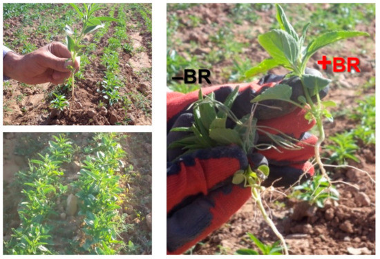 Figure 1. Lallemantia iberica crops from the Kheyr Abad site of the Agriculture and Natural Resources Research and Education Center of Zanjan (Iran). On the right, an example is shown of plant phenotype pictures with brassinolide treatment (+BR) or without brassinolide treatment (−BR).
