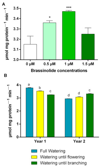 Figure 2. Effects of (A) different concentrations of brassinolides and (B) irrigation regimes in each year on ascorbate proxidase. According to Duncan’s multiple ranges test, bars with the same letter are not significantly different at a 5% statistical level. * p < 0.05 and *** p < 0.001 vs. control (Brassinolide 0 μM).