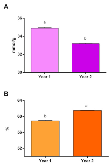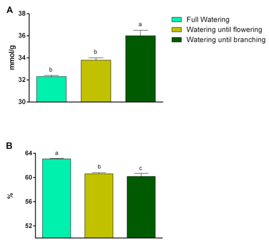 The highest level of MDA (34.9 mmol g−1 FW) was produced in year one (Figure 3A). The watering until branching regime produced the highest level of MDA (36 mmol g−1 FW), while the full watering treatment produced the lowest level of MDA (32.31 mmol g−1 FW). The plants under the full watering and watering until flowering treatments were in a statistical group (Figure 4A).