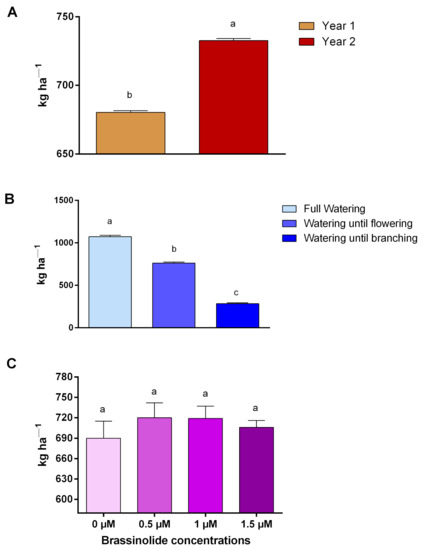 The second year of the experiment produced the highest yield of seed (732.6 kg/h) (Figure 5A). The full watering regime produced the highest amount of seed (1073.3 kg h−1), while watering until branching produced the lowest amount of seed (284.3 kg h−1) (Figure 5B). The grain yield increased by increasing the brassinolide concentration from 0 to 1 μM, and then it decreased with further increases in concentration, although these differences were not significant (Table 1 and Figure 5C).