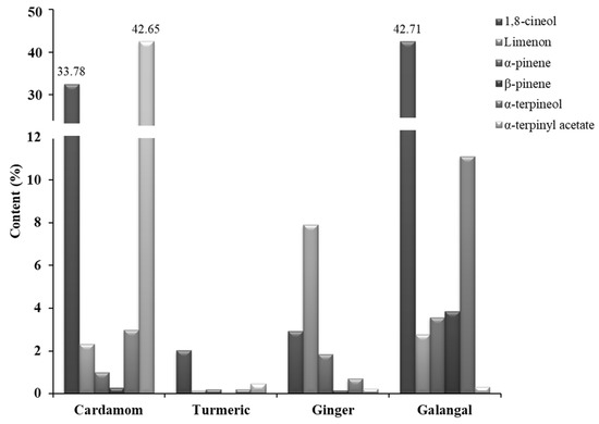 From these results (Table 1), it can be concluded that monoterpenes generally predominate in cardamom and galangal EOs, while sesquiterpenes are mainly found in turmeric and ginger EOs. Interestingly, cardamom rhizome contains the highest content of α-terpinyl acetate, which occurs in the low concentrations in the other herbs. The variations in the content of common individual compounds found in EOs of the Zingiberaceae species studied are shown in Figure 1.