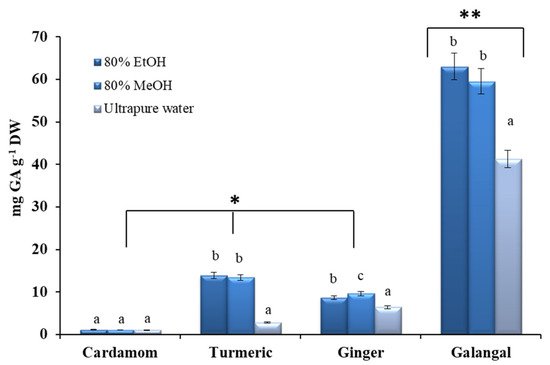 In the case of the ginger rhizome, the highest TPC value (9.63 ± 0.05 mg GA g−1 DW) was found in the methanolic extract, while water resulted in the lowest TPC content (6.42 ± 0.33 mg GA g−1 DW). Similar results were observed in the study by Hester et al. [70].