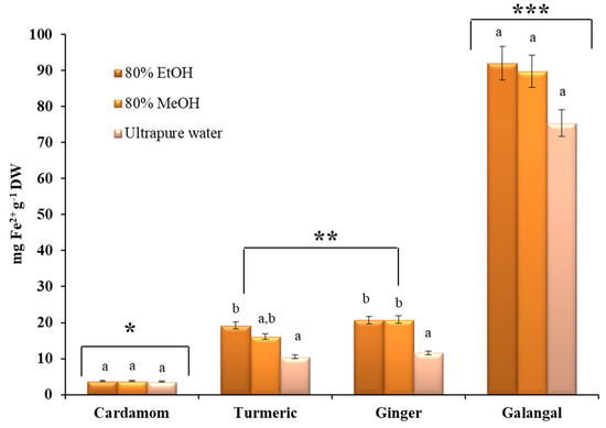 As shown in Figure 3, the highest values (between 75.39 ± 10.57 mg Fe2+ g−1 DW and 92.02 ± 4.09 mg Fe2+ g−1 DW) were found for galangal. A similar trend was observed in the study by Köse et al., who evaluated the antioxidant activity of galangal extracts obtained with water, ethanol and water/ethanol mixture [37]. On the other hand, the lowest FRAP values were observed for cardamom fruits. Finally, no statistically significant difference was found between the reduction capacity of turmeric and ginger crude extracts (Figure 3). The highest FRAP value for turmeric was observed for ethanolic extract (20.82 ± 0.42 mg Fe2+ g−1 DW), which was comparable to the results published by Yang et al. [69]. In the case of the ginger rhizome, the same values were determined for ethanolic (20.73 ± 0.70 mg Fe2+ g−1 DW) and methanolic (20.82 ± 0.42 mg Fe2+ g−1 DW) extracts, while water was inferior as the extraction solvent with a FRAP value of 11.58 ± 1.26 mg Fe2+ g−1 DW.