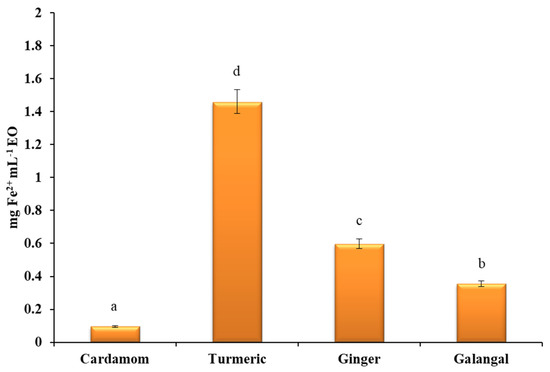 The reducing power of the EOs (Figure 4) was again the lowest for the cardamom sample, while the highest FRAP value was obtained for the EO from turmeric. In contrast to the crude extracts, the EO from galangal showed weaker ferric reducing power. Ginger and galangal oils showed similar antioxidant activities as the study published by Avci et al. [71]. These results can probably be explained by differences in the chemical composition within the EOs studied. Namely, ginger EO and especially turmeric EO are rich in sesquiterpenes, whereas the dominant volatile compounds in cardamom and galangal were monoterpenes. Turmerones (especially ar-turmerone and β-turmerone) are the main compounds believed to be responsible for the antioxidant properties of turmeric EO [72]. For example, in the study of Gounder and Lingamallu, which demonstrated high antioxidant activity of turmeric EO, a significant correlation was found between the reduction of FRAP and the decrease of turmerone content [49]. A similar trend was also observed in the study published by Avanço et al. [16].