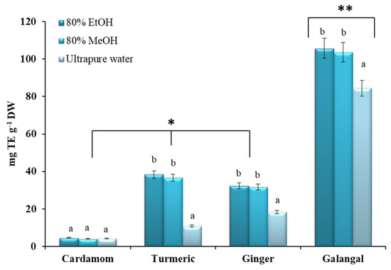Antioxidant activity of selected Zingiberaceae species expressed as mg trolox equivalents per gram of dry weight (mg TE g−1 DW). All measurements were performed in duplicate. For comparison of the mean values, one-way ANOVA followed by S-N-K post hoc were applied. A different superscript letters (a, b) indicate a statistical difference in the extraction efficiencies of the solvents tested (p < 0.05), while asterisks indicate statistical differences in antioxidant activity between different plants (p < 0.05).