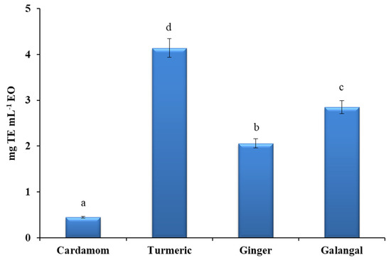 A statistically significant difference was found in the EOs among all the species studied (Figure 6). Compared to the crude extracts, the EOs generally showed weaker ABTS•+ scavenging activity. The highest ABTS value expressed as trolox equivalents (4.14 mg TE mL−1 EO) was observed for turmeric EO, followed by galangal, ginger, and finally cardamom EO.