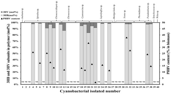 poly(3-hydroxybutyrate-co-3-hydroxyvalerate) (PHBV) production screening in 40 cyanobacterial strains supplemented with 0.4% (w/v) sodium acetate and 0.4% (w/v) sodium propionate under heterotrophic conditions. N.D., no detected polymer production by GC analysis.