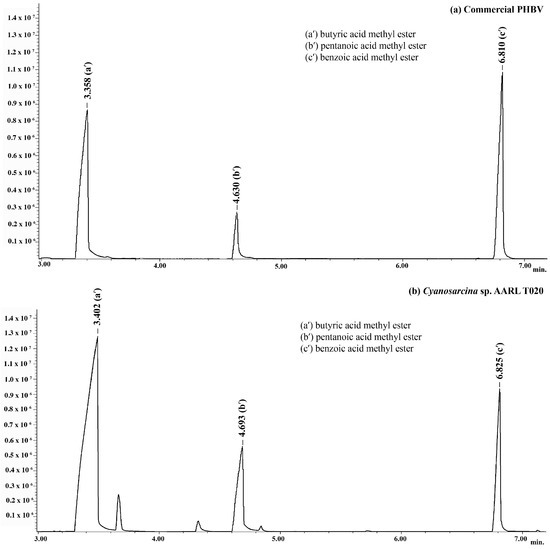 GC spectra of PHBV obtained from (a) Cyanosarcina sp. AARL T020 compared with (b) the commercial standard PHBV.