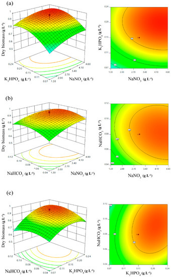 Response surface 3D plots and contour plots of biomass production showing the interaction effects of (a) NaNO3 and K2HPO4; (b) NaNO3 and NaHCO3; and (c) K2HPO4 and NaHCO3.