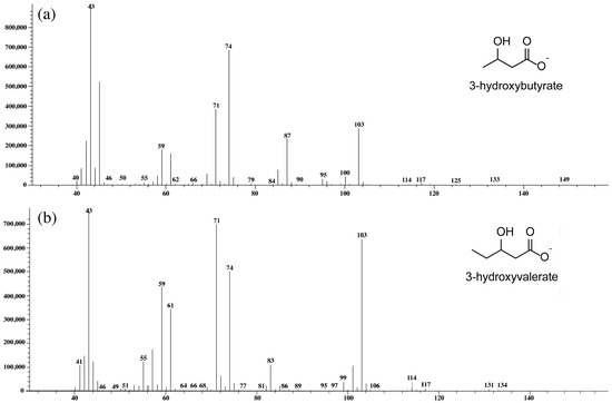 Mass spectrometry analysis of PHBV extracted from Cyanosarcina sp. AARL T020. The (a) 3-hydroxybutyrate (3HB) subunit and (b) 3-hydroxyvaryrate (3HV) subunit were compared with the mass spectra MS library (NIST 11).