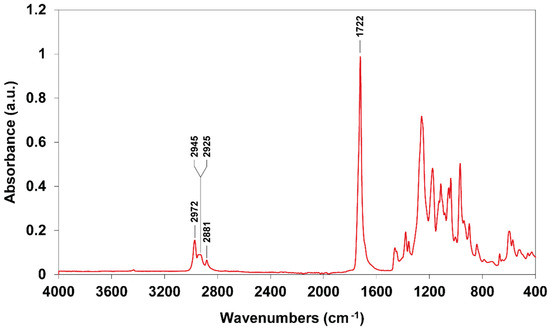 The Fourier transform infrared spectroscopy (FTIR) spectra revealed the different functional groups associated with PHBV (Figure 7). The peak at 2972 cm−1 is represented by the asymmetric stretching mode of the methyl (-CH3) group. The bands in the 2925–2945 cm−1 region indicate the antisymmetric stretching mode of methylene (-CH2). The peak at 2881 cm−1 corresponds to the symmetric stretching mode of CH3. The apparent peak at 1722 cm−1 was assigned to the C=O stretching group, while the bands in the 800–1500 cm−1 region represent the CH3 and CH bending vibrations coupled with C-O-C and C-C stretching vibrations.