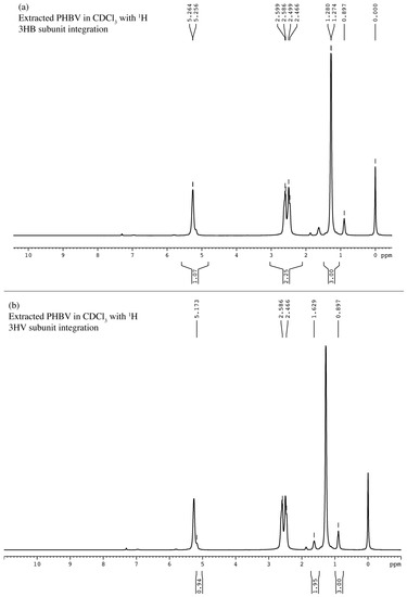 The 1H-NMR spectrum of the extracted polymer dissolved in deuterochloroform exhibited seven clearly vibrating proton signals in a range of (δ) 0.897–5.264 ppm, including the 3HB subunit and 3HV subunit (Figure 6). The 3HB subunit (Figure 8a) presented double signals at 5.256 and 5.264 ppm of asymmetric carbon (-CH) belonging to the chiral carbon atom. The multiplet resonance at 2.586–2.599 and 2.466–2.499 ppm indicates diastereotopic methylene (-CH2) protons. The doublet signals at 1.274–1.280 ppm indicate methyl protons (-CH3). Similarly, the 3HV subunit (Figure 8b) presents chiral carbon (-CH) and methylene proton (-CH2) peaks. In addition, the two singlets at 0.897 and 1.629 ppm indicate ethyl protons (-CH2-CH3).