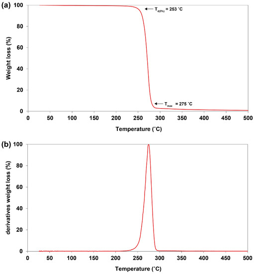 Thermogravimetric analysis (TGA) was used to determine the thermal stability of the extracted PHBV. A one-step process of degradation was observed. The temperature of 5% weight loss (Td(5%)) began around 253 °C (Figure 11a). The maximal degradation temperature (Tmax) was detected at 275 °C, corresponding to the peak of the derivative of the weight loss curve (Figure 11b).