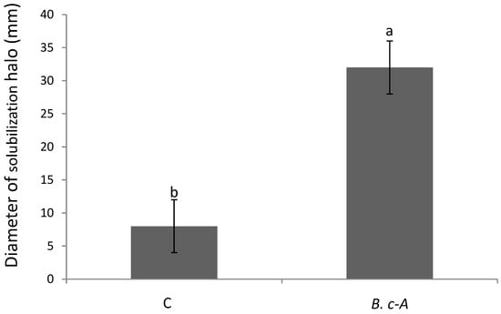 B.c-A, displayed a transparent halo around the colonies grown in Pikovskaya medium in comparison with the control bacteria (a commercial product based on B. subtilis), thus indicating that this isolate is a phosphate solubilizer (Figure 1). This latter difference between the halos in both treatments resulted statistically significant according to Tukey test (p = 0.05).