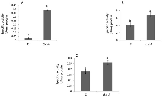 Stress-response enzyme activities in tomato plants treated with B. cereus “Amazcala”. Panel A, superoxide dismutase (SOD); Panel B, catalase (CAT); Panel C, phenylalanine ammonia lyase (PAL). Simbology: C, Control plants mean plant non-treated with the bacterium; B.c-A, plants treated with B. cereus Amazcala. Different letters in each bar for each enzyme activity indicates significant difference according to Tukey test (p = 0.5). The results are the average of 2 independent experiments (n = 3, total in two experiments n = 6).
