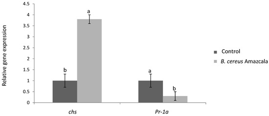In order to study, at a molecular level, the stress-response induced by B.c-A on tomato plants mentioned above, the expression of 2 genes related to plant defense was carried out. The chalcone synthase gene (chs) involved in phenylpropanoids biosynthesis (flavonoids) and the salicylic acid defense pathway gene marker pr1a were analyzed. On the one hand, the expression of chs was significantly induced by B.c-A (Figure 4). On the other hand, the relative gene expression of pr1a significantly decreased when tomato plants were treated with B.c-A in comparison with control plants (Figure 4).