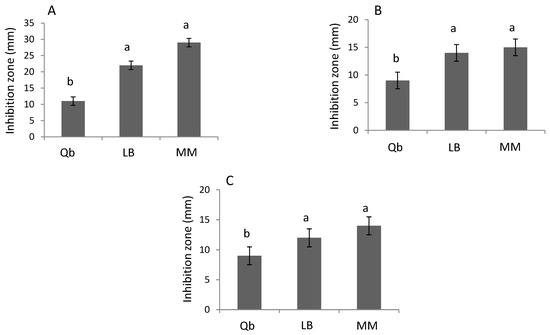 Size of the inhibition zone in the in vitro antagonistic tests of B. cereus Amazcala against 3 isolates of Cmm. Panel A, against isolate sp; Panel B, against isolate AcR42; Panel C, against isolate 1565. B.c-A was grown on Luria Bertani (LB) or minimal M9 medium (MM). As positive control against Cmm, a commercial product (Qbacter, Qb) was evaluated. Different letters in each bar for each panel indicates significant difference according to Tukey test (p = 0.05). The results are the average of three independent experiments (n = 3 for each experiment, total in three experiments n = 9).