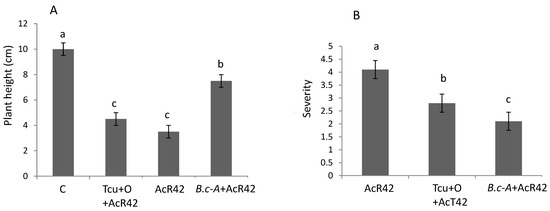 Plant height (Panel A) and severity (Panel B) of bacterial canker disease at 30 days post-inoculation in tomato plants treated with Cmm and/or B. cereus Amazcala under greenhouse conditions. As positive chemical control of bacterial canker, a commercial product (Terra-Cu-Oxymet) was evaluated. Control in panel A refers to plants inoculated only with B. cereus Amazcala. Simbology: C, Control; Tcu+O, Terra-Cu-Oxymet + Cmm AcR42; AcR42, Cmm isolate AcR42; Bc-A, B.cereus-Amazcala. Different letters in each bar indicate significant difference according to Tukey test in panel A, and Kruskal–Wallis H test in panel B, using in both tests a significance of p = 0.05. The results are the average of 2 independent experiments (n = 9 for each experiment, total in two experiments n = 18).