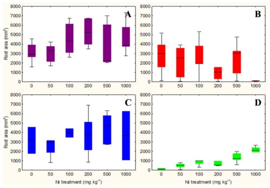 Box-and-whisker plots showing the root surface area (mm2) of test hyperaccumulator species at increasing Ni concentrations (0–1000 mg kg−1): (A) A. utriculata, (B) N. caerulescens and non-hyperaccumulator species (C) A. montanum, (D) T. arvense. In each box, the central line marks the median of the data; the box edges represent the first and third quartiles; whiskers show non-outlier range. n = 20 each treatment.