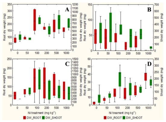 Box-and-whisker plots showing the root and shoot dry biomass (mg) of test hyperaccumulator species at increasing Ni concentrations (0–1000 mg kg−1): (A) A. utriculata, (B) N. caerulescens and non-hyperaccumulator species (C) A. montanum, (D) T. arvense. In each box, the central line marks the median of the data; the box edges represent the first and third quartiles; whisker show non-outlier range. n = 20 each treatment.