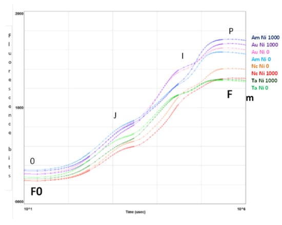 Figure 3 summarizes the transient fluorescence analysis for controls and treatments at Ni 1000 mg kg−1. The curves represent the average values of samples measured for the indicated species at Ni 0 (light colour) and Ni 1000 mg kg−1 (dark colour). The peaks represent the fluorescence values measured at 50 µs (0), 2 ms (J), 30 ms (I) and maximal (P) [44].