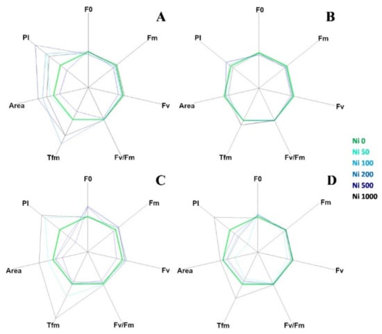 Fluorescence transient analysis of test species represented by spider plots: (A) A. utriculata, (B) N. caerulescens, (C) A. montanum, (D) T. arvense. Parameters considered: F0: dark level fluorescence, Fm: maximum fluorescence, Fv: variable fluorescence, Fv/Fm: maximum efficiency of photosystem II (PSII), Tfm: time (ms) to reaching Fm, Area: area above the fluorescence curve between F0 and Fm, P.I. performance index. Increasing concentrations of nickel correspond to darker shades of blue; green identifies the control. Data are standardized for Ni 0 mg kg−1. Data are the mean of ten measurements per plant. n = 300 each species.