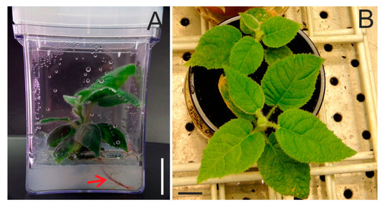 Rooting and acclimatization of the Actinidia chinensis var. deliciosa plants to ex vitro conditions. (A) Plants regenerated from endosperm-derived callus and transferred onto half-strength MS medium in Magenta vessels; visible well-developed roots (arrow). (B) Acclimated plants. Bars = 2 cm.