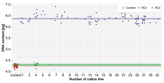 Statistical analyses were performed using R software [41]. Three groups of samples (6Cx control, 6Cx and 9Cx regenerants) were compared by DNA content [pg]. For all data groups, the mean, confidence intervals for 95% (CI) and standard deviation values were calculated using appropriate functions (mean(), CI(), sd(), respectively). For each comparison, the equalities of the variances between the groups were tested using Levene’s test of equality of variance (leveneTest() function). Because variances were not homogenous (p < 0.05), Welch’s heteroscedastic F test (welch.test()) was used to compare the data between the groups. The difference was regarded as significant when p < 0.05. The ggplot2 package [42] was used to generate Figure 2.