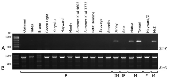 Amplification bands of SmY (A) and SmX (B) in selected cultivars of Actinidia chinensis var. deliciosa. Hayward/Z and M/Z indicate cv. Hayward and a male pollinator obtained from Zespri International Ltd. F—female, IF—inconsistent female, IM—inconsistent male, M—male.