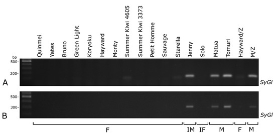 Amplification bands of the SyGl genic intron/exon (A) and SyGl 3′ promoter region (B) in selected cultivars of Actinidia chinensis var. deliciosa. Hayward/Z and M/Z indicate cv. Hayward and a male pollinator obtained from Zespri Internationatl Ltd. F—female, IF—inconsistent female, IM—inconsistent male, M—male.
