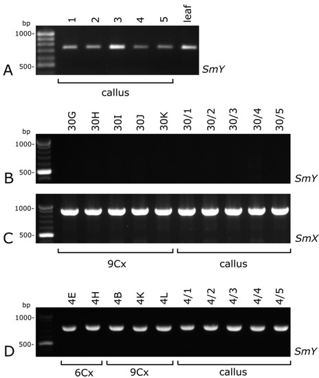Based on these results, for the further analysis of the sex of endosperm-derived callus the SmY marker was selected. When no products of this marker were obtained, an additional amplification of SmX was performed as the positive control. In 11 lines of endosperm-derived calli, the PCR product of SmY was detected (therefore, male callus), and in 10 lines, this PCR product was not found (female callus). The determination of sex for all 97 regenerants was consistent with the sex established for the each of the calli lines (Figure 5B–D, Table 1). Plants regenerated from a particular male line of callus tissue could differ in their DNA content (6Cx or 9Cx) even though their sex was the same (Figure 5D). Thus, SmY was detected at all stages of culture (from callus to regenerants), regardless of the level of ploidy.