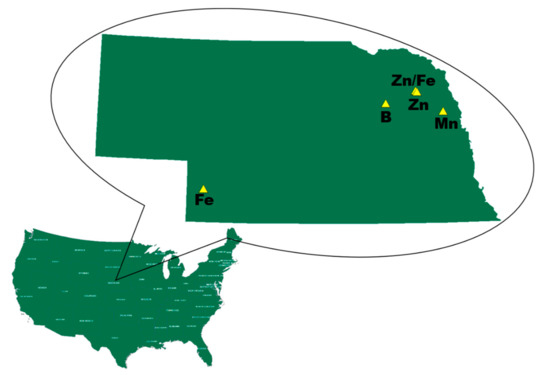 The application of foliar micronutrients to avoid micronutrient deficiencies for deficient soils is a common practice worldwide [4,5]. Foliar applications have several benefits which often make this method an ideal choice for application of micronutrients over soil applications. These benefits include: (1) the avoidance of interaction with soil properties; (2) in-season application during high plant demand; (3) rapid plant response to application; and (4) cost effective for one time application [6]. However, despite high soil fertility in Nebraska, maize has a high rate of nutrient uptake during specific growth stages and demand may exceed supply [1]. Most research on foliar-applied B, Mn, Fe, and Zn on maize have focused on single application times, both in deficient and sufficient field locations and have reported inconsistent and mixed results [7,8,9,10,11,12,13,14,15,16]. Potarzycki and Grzebisz [14] reported an increase in maize grain yield of nearly 18% for a three-year average with the application of 1.0 to 1.5 kg foliar Zn ha−1 and Nelson and Meinhardt [13] reported an increase in maize grain yield of 6% for a three-year average with the application of 0.56 kg foliar B ha−1 while many others show no significant yield increase. Differential yield responses for each of these studies were not associated with a consistent predictor such as low soil or plant nutrient concentration, soil organic matter, pH, or texture.
