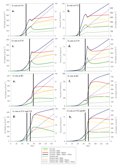 Zn uptake (g Zn ha−1) and partitioning graphs. Solid and dashed lines represent foliar Zn treated plots and control plot, respectively. Solid vertical lines represent the time of application expressed as days after sowing. (a–h) corresponds with the treatments.