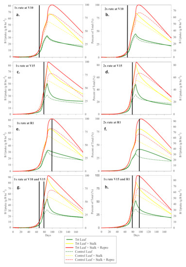 B uptake (g B ha−1) and partitioning graphs. Solid and dashed lines represent foliar B treated plots and control plot, respectively. Solid vertical lines represent the time of application expressed as days after sowing. (a–h) corresponds with the treatments.