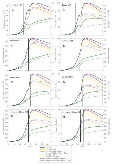 Mn uptake (g Mn ha−1) and partitioning graphs. Solid and dashed lines represent foliar Mn treated plots and control plot, respectively. Solid vertical lines represent the time of application expressed as days after sowing. (a–h) corresponds with the treatments.