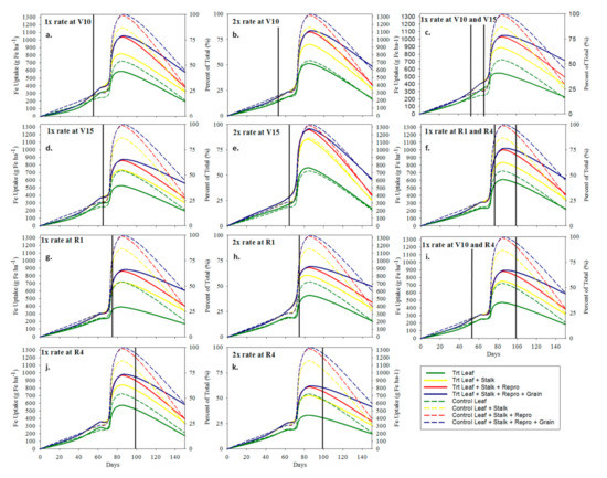 Fe uptake (g Fe ha−1) and partitioning graphs. Solid and dashed lines represent foliar Fe/Zn treated plots and control plot, respectively. Solid vertical lines represent the time of application expressed as days after sowing. (a–k) corresponds with the treatments.