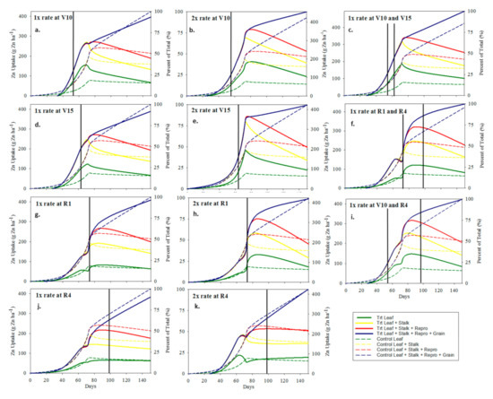 Zn uptake (g Zn ha−1) and partitioning graphs. Solid and dashed lines represent foliar Fe/Zn treated plots and control plot, respectively. Solid vertical lines represent the time of application expressed as days after sowing. (a–k) corresponds with the treatments.
