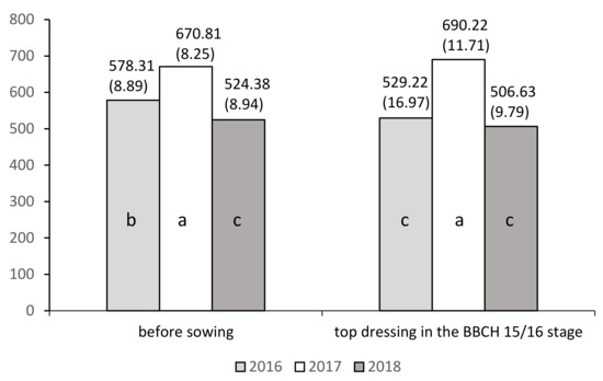 For this trait, significant interaction was found between the date of supplementary nitrogen fertilization (C) and the year of research at stage BBCH 17/18. Figure 4 indicates that significantly the highest mean SPAD index (690.22) occurred in 2017 at BBCH 17/18 for both dates of additional fertilization application. The lowest mean values of the SPAD index were recorded in 2018 for both dates of additional fertilization application (524.38, 506.63), and in 2016 for top dressing (529.22).
