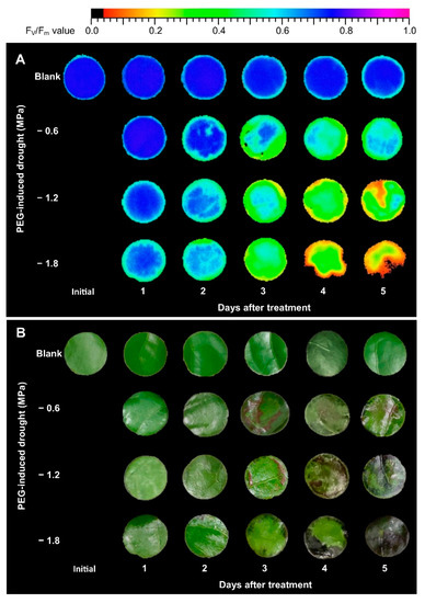 Chlorophyll fluorescence image (A) and leaf appearance correspond to Fv/Fm (B) value under PEG-induced osmotic stress during a 5-day period.