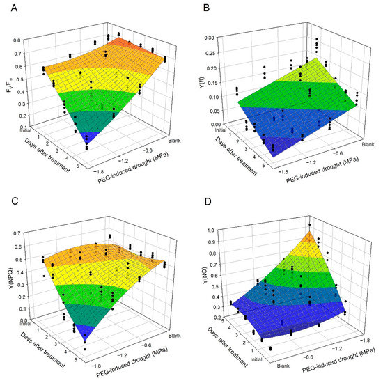 Scatter plots and regression surfaces of the maximum quantum yield of PSII (Fv/Fm) (A), actual photosynthetic efficiency of PS II (Y(II)) (B), quantum yield of regulated energy dissipation (Y(NPQ)) (C), and quantum yield of non-regulated energy dissipation (Y(NO)) (D) value in tea leaf discs as affected by PEG-induced osmotic stress during a 5-day period.