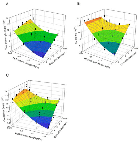 Scatter plots and regression surfaces of total chlorophyll (A), Chl a/b ratio (B), and carotenoids (C) in tea leaf discs as affected by PEG-induced osmotic stress during a 5-day period.