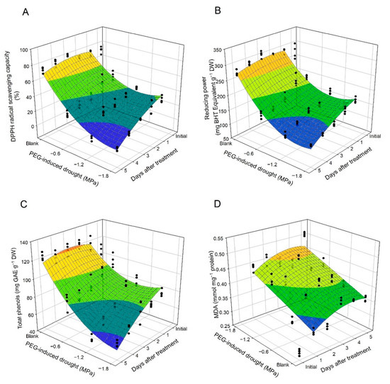 Scatter plots and regression surfaces of DPPH radical scavenging capacity (A), reducing power (B), total phenols (C), and MDA (D) content in tea leaf discs as affected by PEG-induced osmotic stress during a 5-day period.