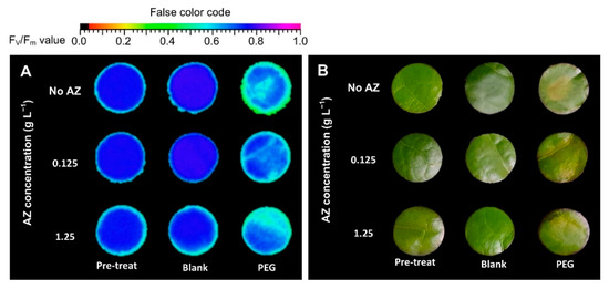 Chlorophyll fluorescence image (A) and leaf appearance correspond to Fv/Fm (B) value of tea leaf discs with pre-treatment (Pre-treat) of three different azoxystrobin (AZ) levels and then treated by blank solution (Blank) and PEG-induced osmotic stress (PEG), respectively.