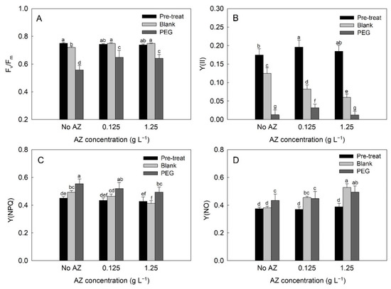 Y(II) in leaf discs with 0.125 g AZ L−1 (0.20) was significantly higher (p < 0.05) than without AZ (0.17) after a 1-day pre-treatment, while Y(II) under the blank treatment declined with increasing exogenous AZ on the third day after treatment. A sharp decrease in Y(II) under PEG treatment was observed on the third day after treatment, and Y(II) with 0.125 g AZ L−1 pre-treatment was higher than the others (Figure 6B). Y(NPQ) in leaf discs after 1-day pre-treatment was 0.43–0.45. Under blank treatment for 3 days, Y(NPQ) declined with an increase in exogenous AZ. A similar trend was observed in Y(NPQ) under PEG-induced osmotic stress (Figure 6C). Y(NO) in leaf discs after 1-day pre-treatment was 0.37–0.39. Under blank treatment for 3 days, Y(NO) increased with an increase in exogenous AZ. Furthermore, Y(NO) in leaf discs treated with 1.25 g AZ L−1 was significantly higher (p < 0.05) than others under PEG-induced osmotic stress 3 days after treatment (Figure 6D).