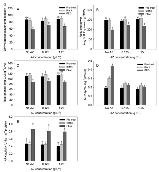 Change in DPPH radical scavenging capacity (A), reducing power (B), total phenols (C), malondialdehyde (MDA) (D), and ascorbate peroxidase (APX) activity (E) of tea leaf discs with pre-treatment (Pre-treat) of three different azoxystrobin (AZ) levels and then treated with blank solution (Blank) and PEG-induced osmotic stress (PEG), respectively. Values are the means (n = 4) with standard errors shown by vertical bars. Different letters (a–g) represent statistically different means (LSD, p < 0.05).
