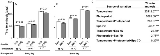Duration of whole phase from seedling emergence to anthesis for the lines carrying Eps-7D-late (open bars) or -early (closed bars) on Ppd-D1a background under three growing temperatures under long (A) and short days (B). Error bars indicate the standard error of the means (SEMs) and the “p” values stand for the level of significance exclusively due to the action of the Eps-7D gene within each temperature and photoperiod condition. The output (mean squares) of the three-way ANOVA for time to anthesis (days) is included on the right (C). Significance level * p < 0.05; *** p < 0.001; NS = non-significant.