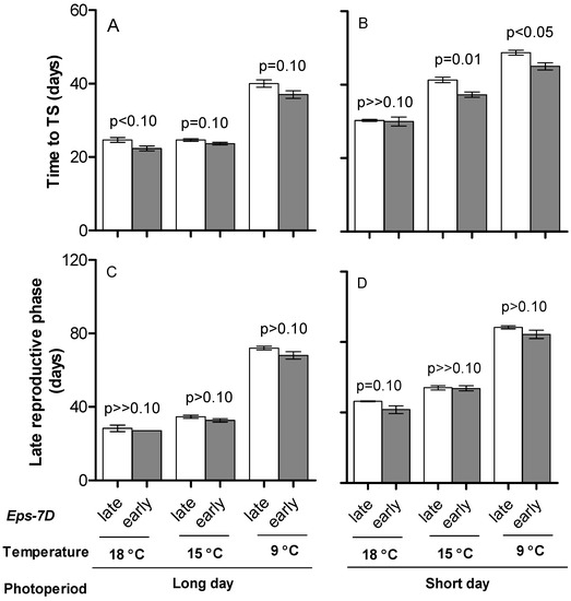 Duration of phase from seedling emergence to TS (A,B) and time from then to anthesis, late reproductive phase (C,D) for the lines carrying Eps-7D-late (open bars) or early (closed bar) on Ppd-D1a background under long (A,C) and short days (B,D) at three temperatures. Error bars indicate the SEMs and the “p” values stand for the level of significance exclusively due to the action of the Eps-7D gene within each temperature and photoperiod condition.
