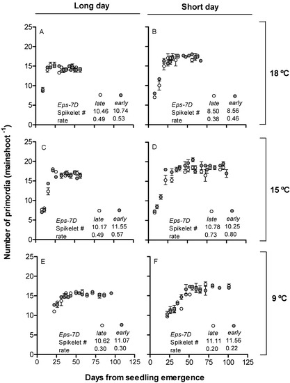 Relationship between number of primordia and days from seedling emergence for Eps-7D-late (open circles) and early (closed circles) under long (A,C,E) and short days (B,D,F) at 18 (A,B), 15 (C,D) and 9 °C (E,F). Inside each panel are the total number of spikelet primordia and rate of spikelet initiation (spikelets day−1).